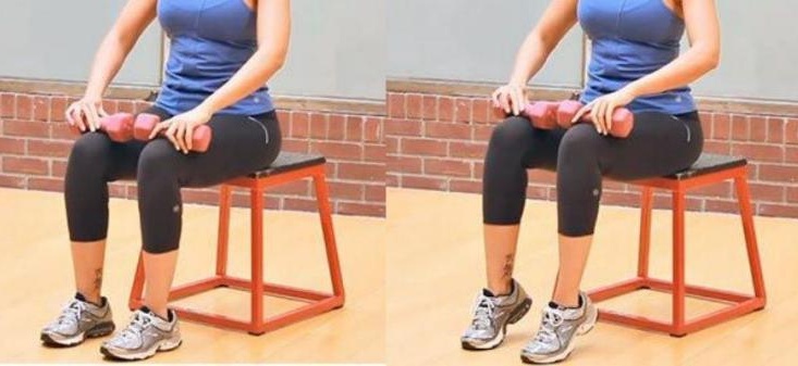 坐在椅子上,交替或一起提起脚后跟,保持3秒钟,然后慢慢放下。可以在大腿上负重,提高练习强度。