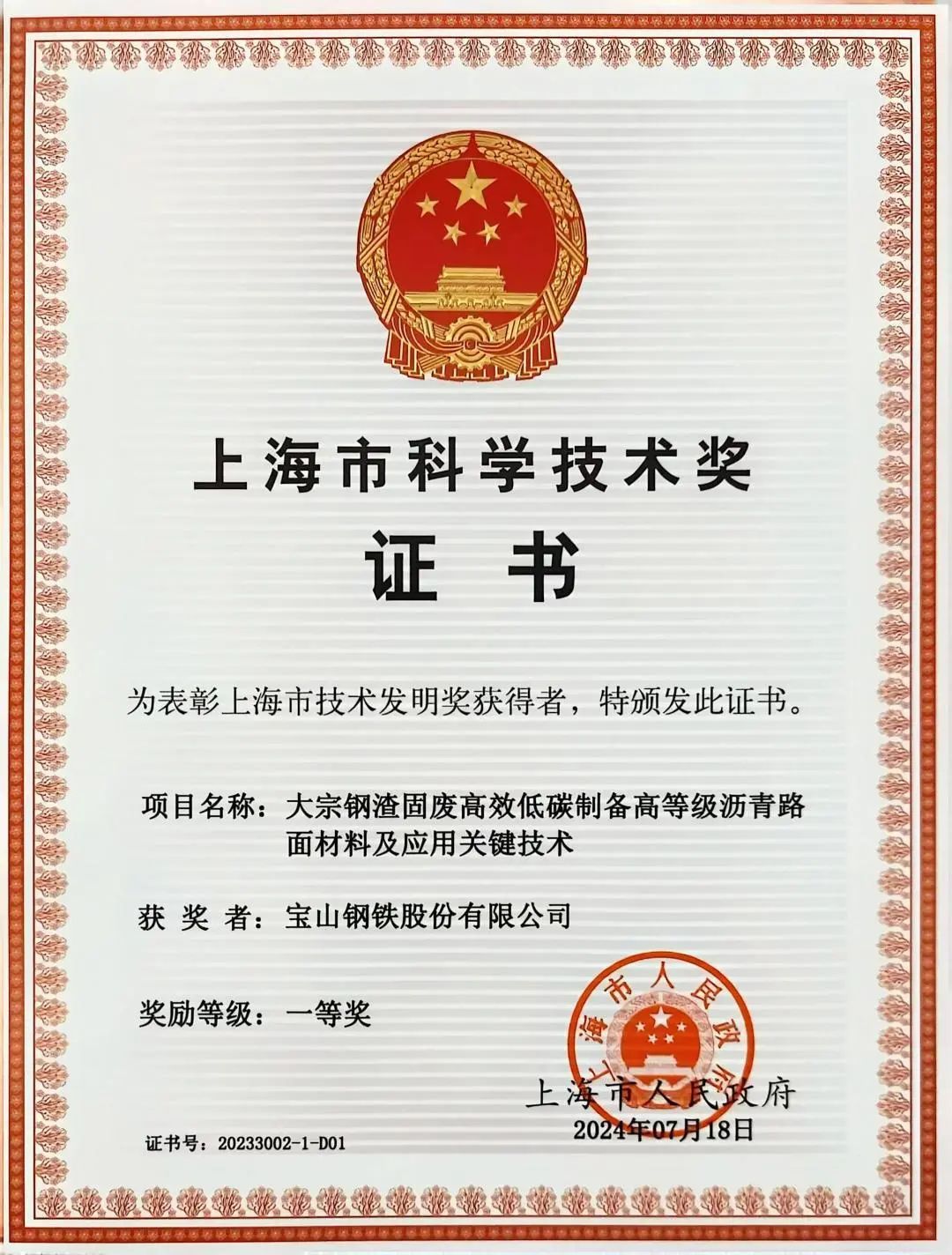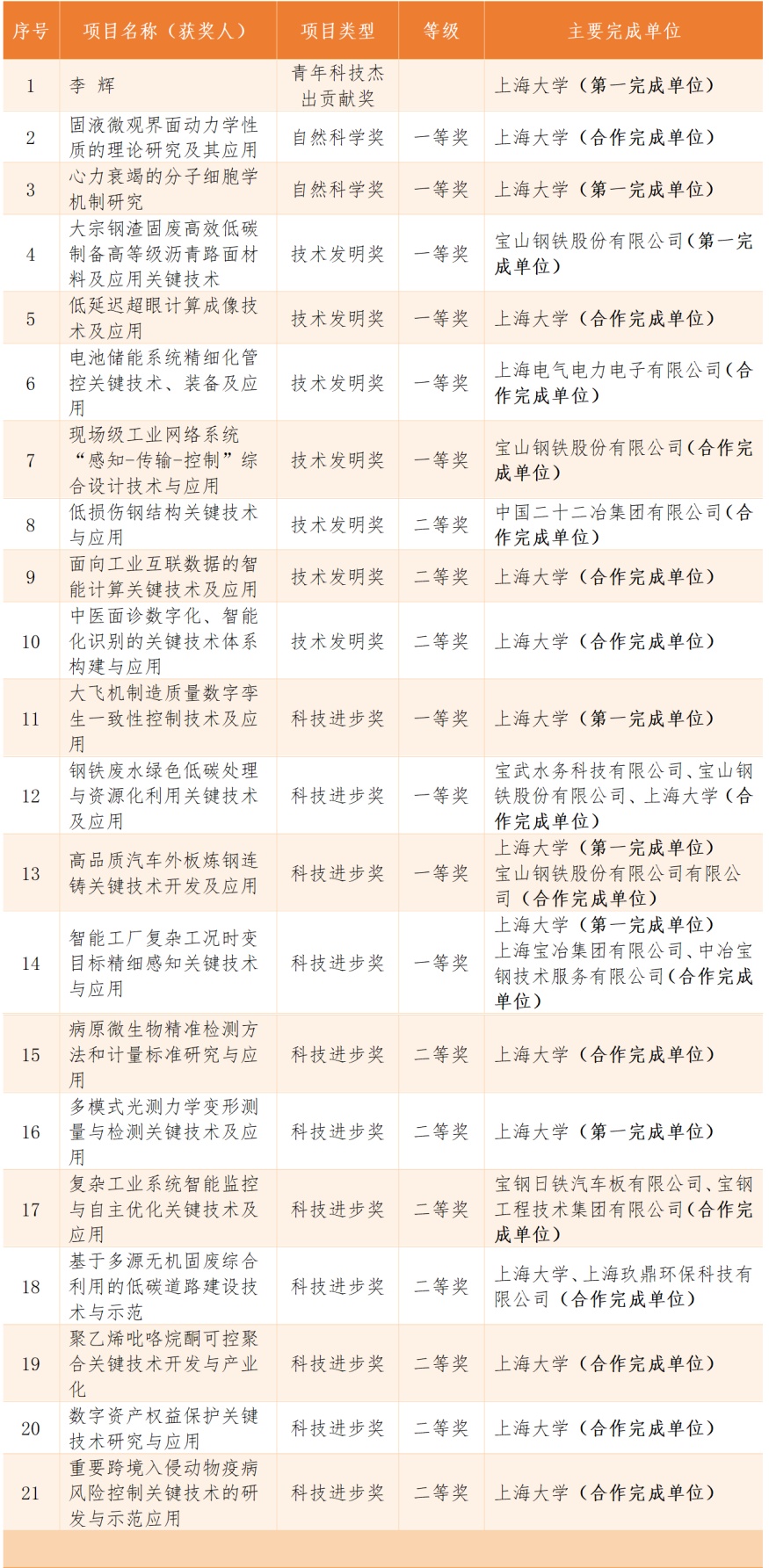 上海市科技大会暨科学技术奖励大会于昨日举行,2023年度上海市科学技术奖授奖214项(人),宝山区企事业单位获奖21项,其中宝山区人民政府提名获上海市科技发明奖一等奖1项,该项目是此奖项中唯一一个由区政府提名的获奖项目。