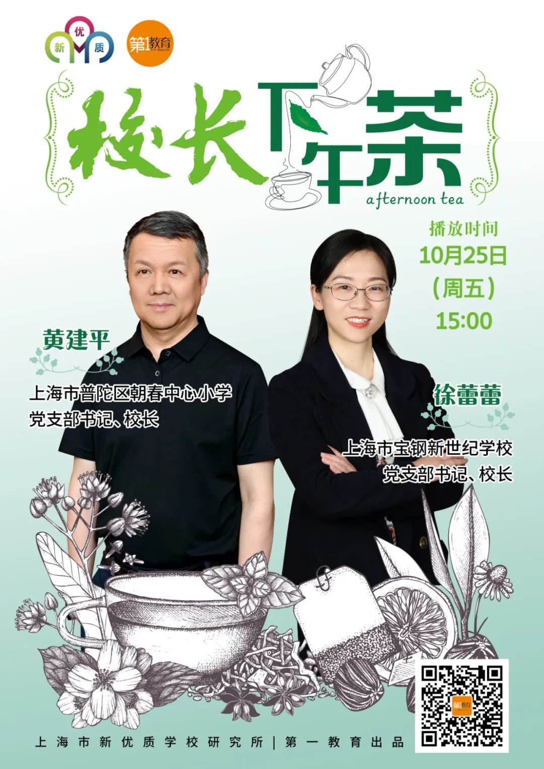 明天(10月25日)15:00 “校长下午茶”第二季第四期 聊聊单元教学与作业设计 上海市宝钢新世纪学校 党支部书记、校长 徐蕾蕾 上海市普陀区朝春中心小学 党支部书记、校长 黄建平