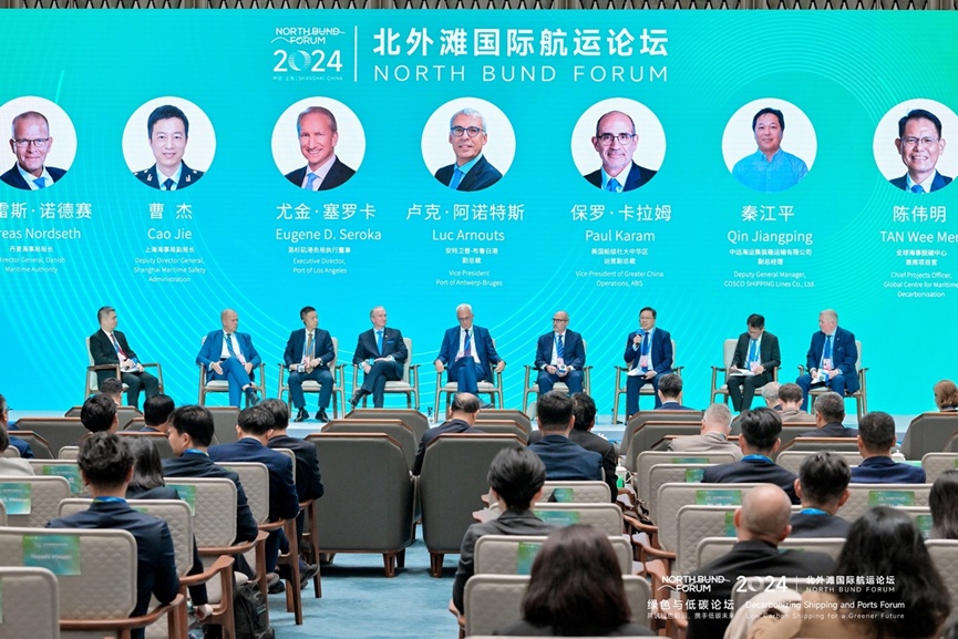 10月23日,由北外滩国际航运论坛组委会主办,上海海事大学、亚洲海事技术合作中心(MTCC)承办,国际航运公会(ICS)协办的2024北外滩国际航运论坛“绿色与低碳”论坛在世界会客厅举行。论坛以“共筑绿色航运,携手低碳未来”为主题,邀请相关政府部门、国际组织、航运企业、行业专家等发言致辞,来自英国、美国、俄罗斯、丹麦、法国、波兰、意大利、新加坡、孟加拉国、比利时、加纳、日本、肯尼亚、马来西亚等30多个国家和地区的260名代表参会,其中外宾100余人。
