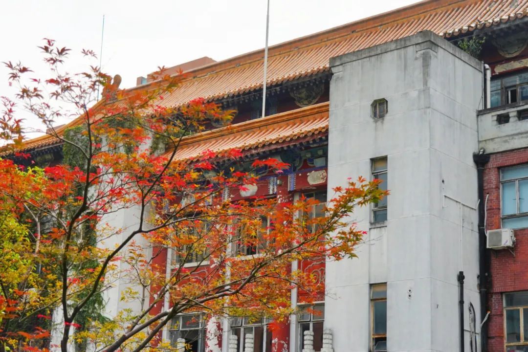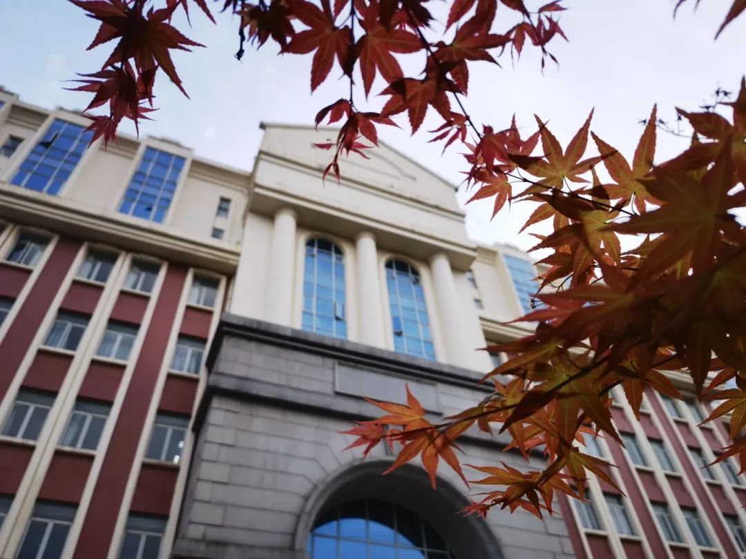 复旦大学上海医学院的校园里,秋染古韵楼,红叶衬静美。