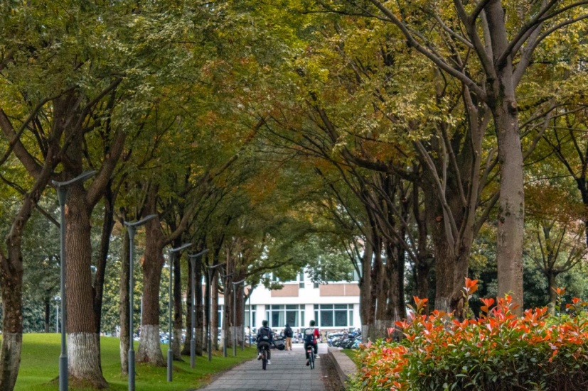 上海工程技术大学通向教学楼的林荫大道添了一抹秋黄,微风袭来,满是秋天的味道。
