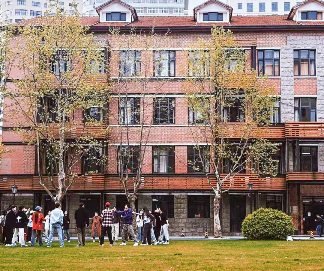 上海戏剧学院的红楼前一片金灿灿,满眼秋色,学生们在草坪上进行戏剧传递练习,感受秋日凉爽。