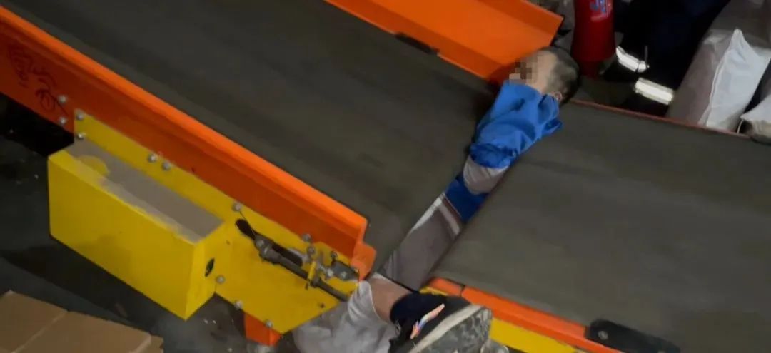 经后续调取监控了解,当时该男子站在传送带上面进行快递分拣,不慎一脚踏进两个传送带之间,人直接就被卷了进去。在这里提醒厂房管理人员及工作人员,要提高安全意识,定期检查维护设备,严格按照规程操作。