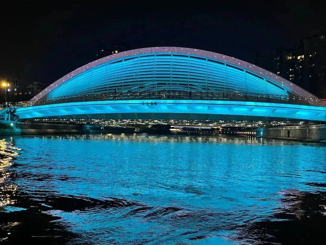 两岸桥梁、树木、草地、街心花园、历史文化建筑、楼宇被灯光点亮,熠熠生辉,“一桥一特色,一湾一风景”,让晚间在此散步休闲的市民感受静谧雅致的都市夜景。