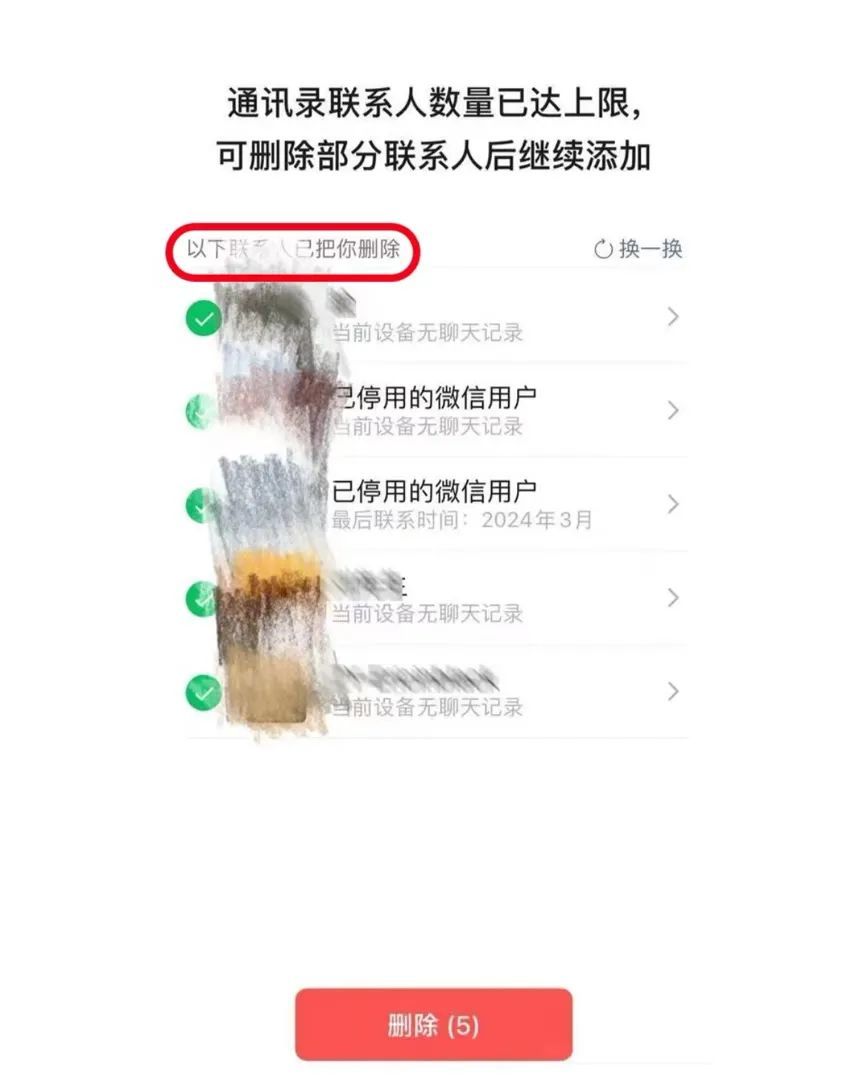 据北京日报报道,多名网友晒出的截图显示,微信提示“通讯录联系人数量已达上限,可删除部分联系人后继续添加”,并给出几个联系人选项,用户可直接删除或选择“换一换”。