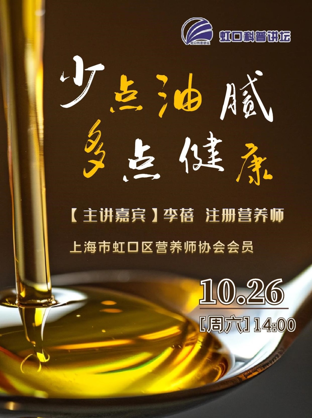 油是我们日常饮食中不可或缺的一部分。针对我国居民膳食结构中油脂摄入过多的现象以及为了提升国民的整体健康水平,国民营养健康指导委员会办公室与中国营养学会联合多家机构在今年4月发布了“减少油脂摄入”的倡议。关于如何减少用油量、如何正确选择食用油及科学搭配等问题,上海市虹口区营养师协会注册营养师李蓓将在本次讲座中详细讲解。
