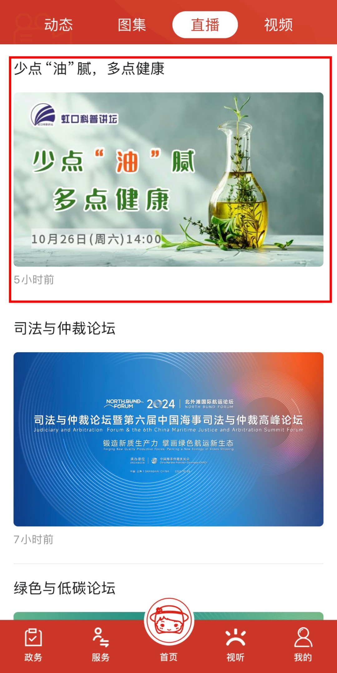 ②在APP“视听”板块找到“直播”,点击进入该场直播