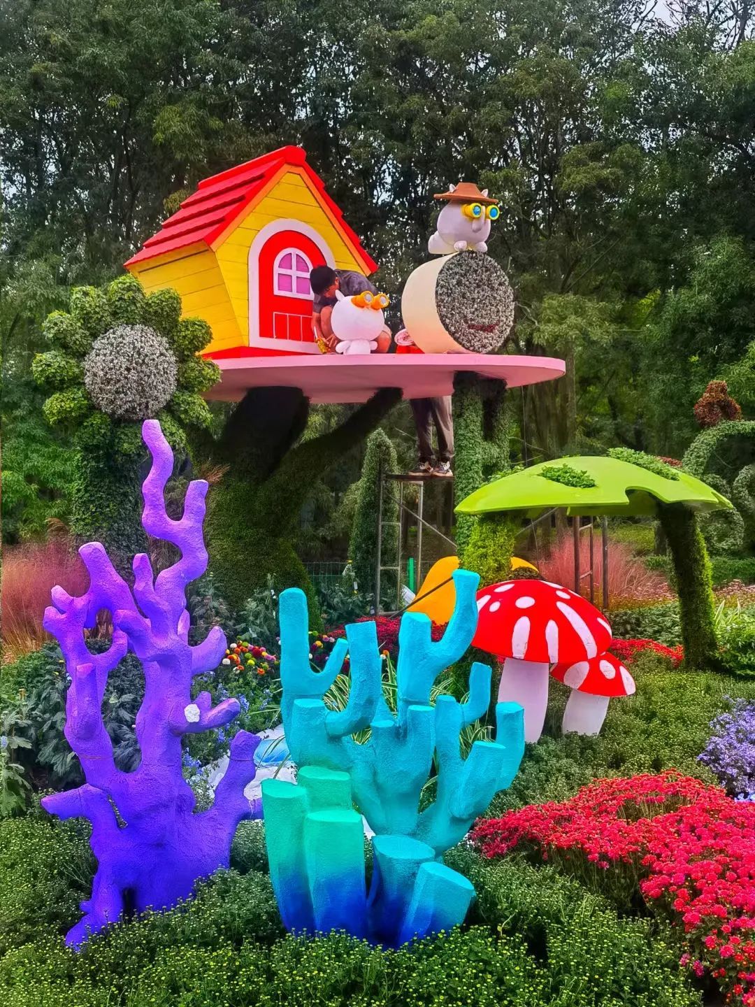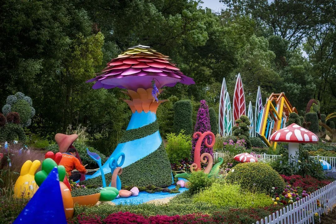室外景点展区位于原花艺馆位置,将依托森林背景结合菊花展主题布置8组室外景点,以菊花为主要造型材料,结合绿雕、花园等形式,打造丰富多样的菊花景观。