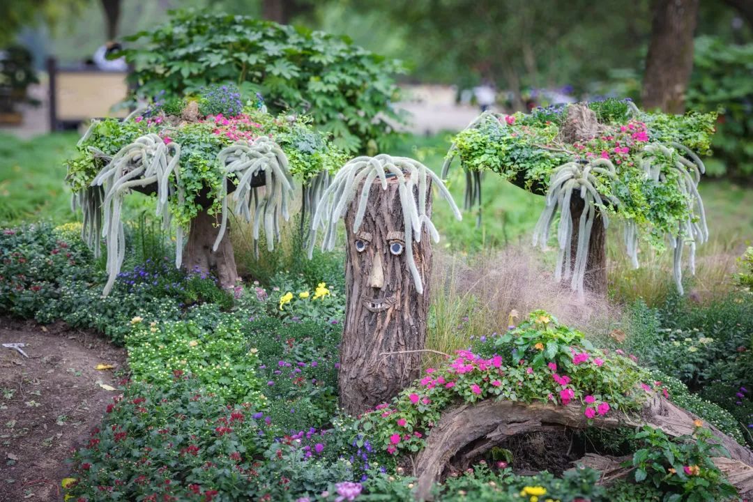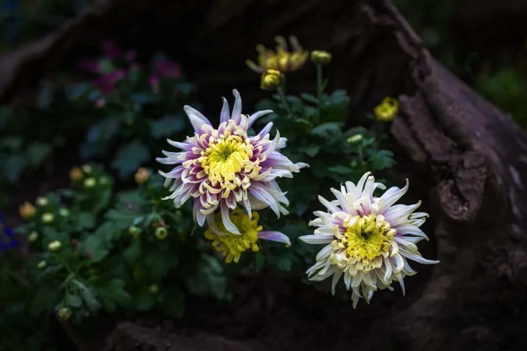值得一提的是,本次菊花展的环境布置结合了公园现有的自然景观,以西、南大门入口互相贯通的主干道为主,采用立体与平面布置相结合的方法,以菊花材料为主,沿线布置菊花花坛、菊花自然花境等景观,烘托菊花展的热烈氛围。同时以台风倒伏树木为原材料,融入各色菊花,创作树干、树根、树枝等园艺景观,增添菊花展特色与亮点。