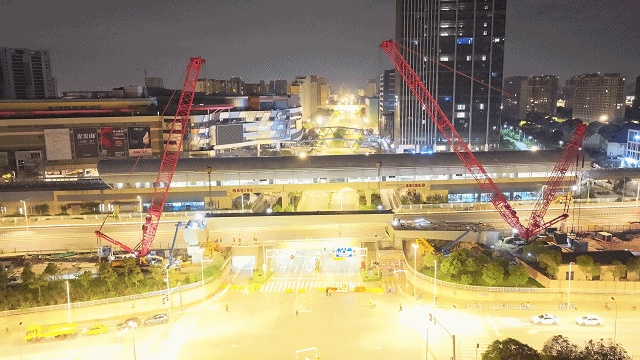 10月24日凌晨1:00,陈翔公路地面道路实施临时封闭。随着起吊命令的下达,两台吊机相互配合,跨路钢结构箱梁被缓慢吊起。经过近3小时连续奋战后,两段钢箱梁先后稳稳落位至陈翔公路南北两侧的高架承台上,吊装工作圆满完成。