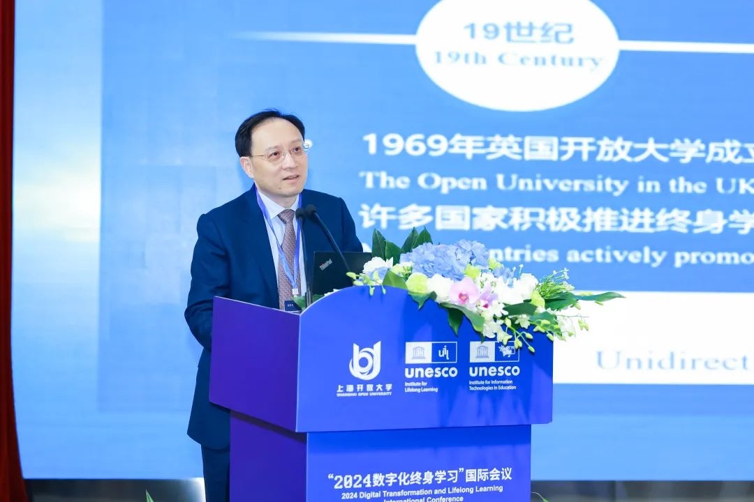 上海开放大学党委书记闵辉代表主办方致辞。他表示,终身学习是全球应对社会经济变革、推动可持续发展的重要选择,数字化时代为教育发展带来了新的机遇与挑战。上海开放大学将从构建泛在可及的数字化学习环境、提升市民的数字素养、创建多元协同的智慧教育生态三方面持续推进数字化终身学习。