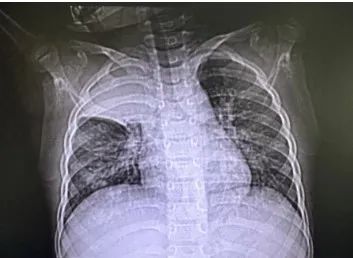 该患儿入院前三天突发咳喘,出现发热后前往上海市儿童医院呼吸科就诊。呼吸专科门诊医生胸片检查发现两肺纹理增多,右上肺高密度影,可能存在感染性病变;随即被收治入呼吸科病房。入院后患儿血氧饱和度最低仅89%,出现呼吸衰竭,紧急肺部 CT 检查发现右肺上叶影像完全消失,右肺少量胸腔积液。