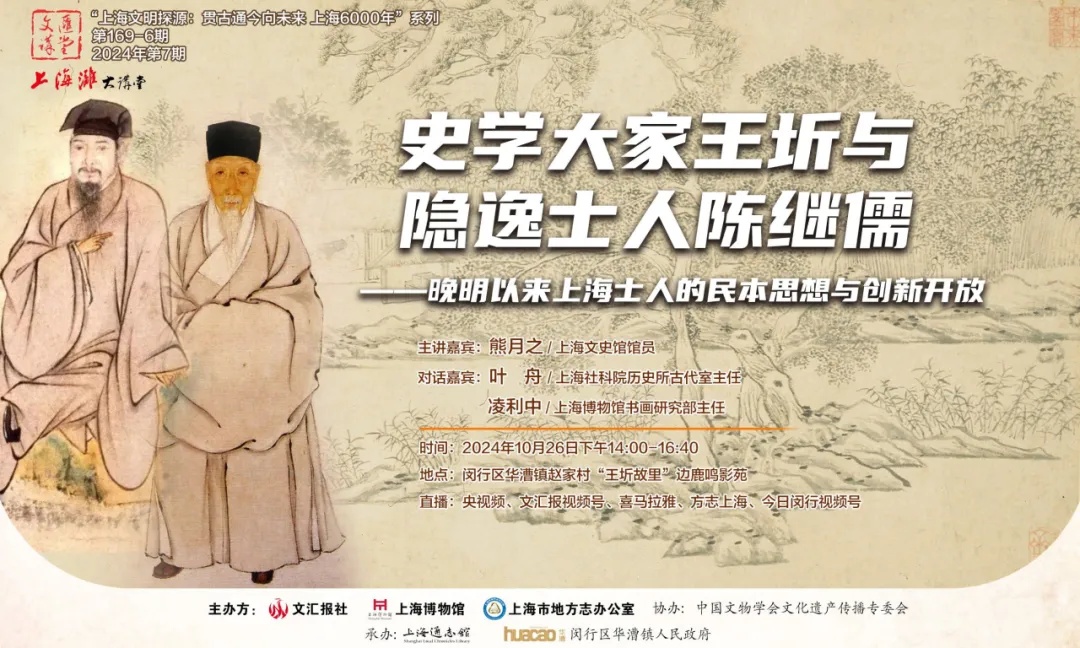 华漕镇升级版“王圻故里”展陈馆即将揭幕 今日下午两点 贯古通今向未来的 “上海6000年”系列第六讲暨前湾大讲堂 将率先走进华漕镇赵家村 与史学大家王圻和隐逸士人陈继儒等 晚明文人代表 展开一场跨越时空的对话 这些优秀的古代知识分子 他们的努力给我们留下了哪些丰富遗产? 他们的遗憾又给我们什么启示? …… 主题:“史学大家王圻与隐逸士人陈继儒——晚明以来上海士人的民本思想与创新开放” 主讲嘉宾:熊月之 上海文史馆馆员 对话嘉宾: 叶舟 上海社科院历史所古代室主任 凌利中 上海博物馆书画研究部主任 主办单位:文汇报社、上海博物馆、上海市地方志办公室 协办单位:中国文物学会文化遗产传播专委会 承办单位:上海通志馆、闵行区华漕镇人民政府 直播时间:10月26日(周六)14:00—16:40 观看形式:扫描下方二维码进入直播 转载请注明来自今日闵行官方微信