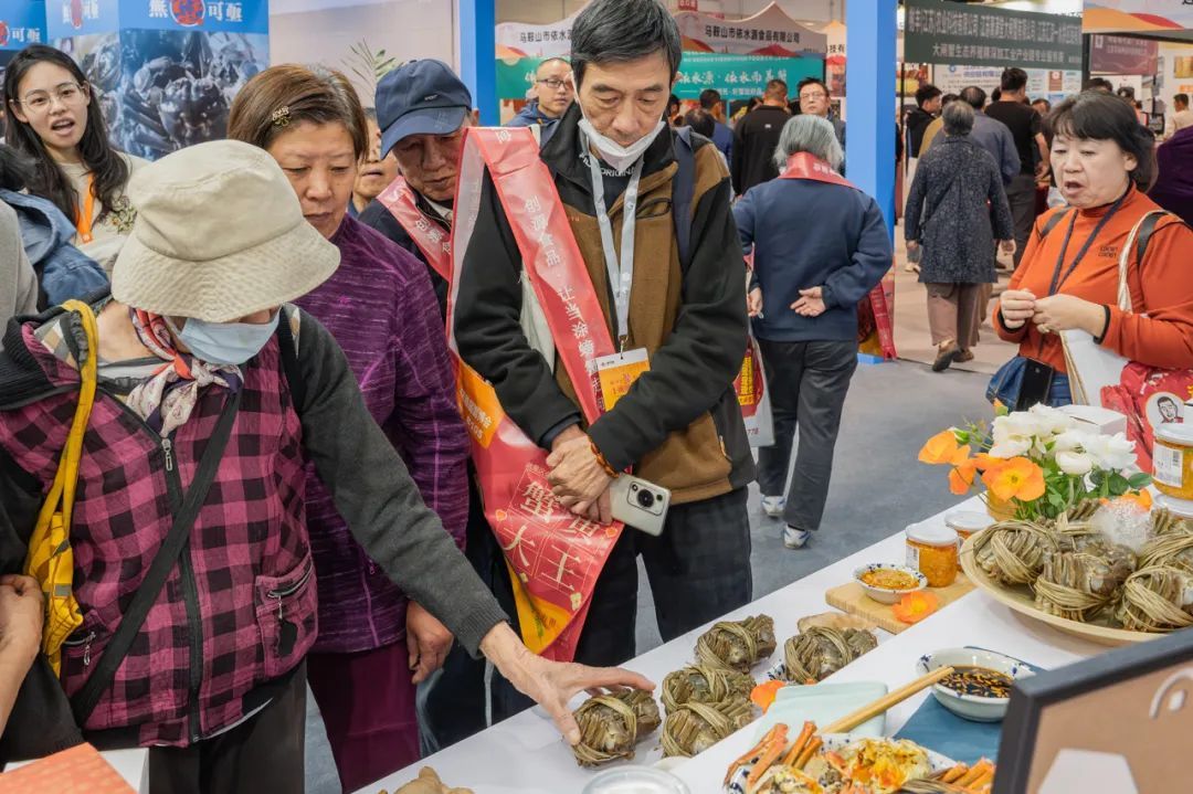 除了地产河蟹,来自江苏、浙江、安徽、辽宁、新疆、宁夏等地的参展品牌,也充分展示展销优质的河蟹及河蟹加工衍生品,各个摊位前都聚集了不少市民前来品尝、选购。
