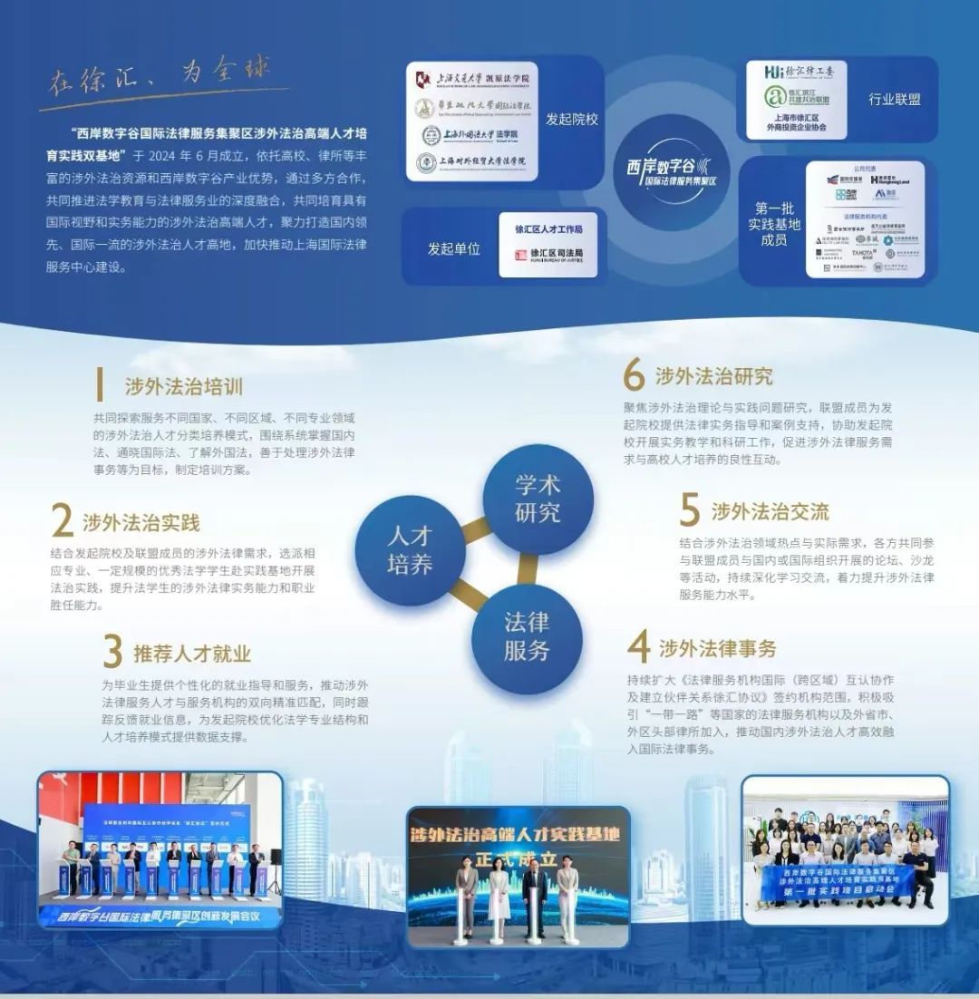 10月24日今天,徐汇区“西岸数字谷国际法律服务集聚区涉外法治翻译人才培养基地”揭牌仪式在西岸模速空间举行。 “涉外法治翻译人才培养基地”作为“西岸数字谷国际法律服务集聚区涉外法治高端人才培育实践双基地”模式下成立的首个聚焦法治翻译人才培养的平台,着眼于涉外人才法学教育及法律语言能力提升,致力于培育更多精通国内、国际法的英语及小语种涉外法治人才,为持续提升涉外法律服务能力水平提供了坚强人才保障。 活动中,“涉外法治翻译人才培养基地”聘请了香港中文大学(深圳)国际事务研究院副研究员、规则标准与涉外法治研究中心主任游传满,华东政法大学金砖国家法律研究院副研究员、南亚研究部主任费秀艳作为首批翻译专家顾问。两位专家均具有丰富的涉外法治教学经验,参与多本法学著作的翻译工作,将以基地设立为契机,更好指导培养更多跨语言、跨法域、跨国界的法治翻译人才,推动涉外法学教育与涉外法律服务市场的共融发展,更好推进上海国际法律服务中心建设。 游传满 香港中文大学(深圳)国际事务研究院副研究员,规则标准与涉外法治研究中心主任,深圳市法学会常务理事。研究领域为跨国并购法律、金融科技规范、大数据平台治理。游博士先后获得西南政法大学法学学士、中国人民大学法学硕士、德国汉堡大学暨意大利博洛尼亚大学欧盟法经济学硕士、英国苏萨克斯大学法学博士等学位。曾在爱尔兰都柏林大学、英国牛津大学、以色列特拉维夫大学、新加坡国立大学等高校从事跨国并购法与数据平台规制的科研、教学工作。 费秀艳 华东政法大学金砖国家法律研究院副研究员,南亚研究部主任。研究领域为国际经济法、国际商事仲裁与调解、印度法。费博士于2015年从爱尔兰都柏林大学获得法学博士学位,2011-2012学年访问纽约大学,2017年入选上海市浦江人才项目。 本次活动还邀请了新加坡国立大学副校长、教授陈西文(Simon Chesterman)作“人工智能向善发展与法治建设”主旨演讲,并与来自上海交通大学凯原法学院、华东政法大学、上海数科律师事务所等涉外领域专家学者进行与谈交流,共同探讨人工智能法律监管及法治保障问题,本次活动为全英文法治学术交流,来自“涉外法治高端人才培育实践双基地”联盟成员代表近200人参加活动。 近期,“涉外法治翻译人才培养基地”还将开展法律实务全英文交流项目,围绕中欧跨境争议解决、中企出海南美、非洲投资中转站等主题,本区律师和基地学员将与区域内外资所进行全英文主旨交流,并参与相关外国法研究、法律文书翻译等涉外法治理论及实务工作。 “西岸数字谷国际法律服务集聚区涉外法治高端人才培育实践双基地”于2024年6月成立,由徐汇区司法局、徐汇区人才工作局与华东政法大学国际法学院、上海交通大学凯原法学院等4所高校及君合、竞天公诚等区内头部律所以及相关人工智能企业等联合发起,通过涉外法治培训、法治实践、法治研究等方式,共同培育具有国际视野和实务能力的涉外法治高端人才。目前已顺利完成第一批高校学生实践项目,并开展多场涉外法治交流活动,西南政法大学、香港中文大学(深圳)等高校也将加入实践基地,联盟朋友圈不断扩大。 下一步,徐汇区司法局将始终坚持人才引领发展战略地位,依托西岸数字谷国际法律服务集聚区资源汇聚优势,充分发挥涉外法治高端人才培育实践平台“乘数效应”,引入更多优秀法律翻译人才,加大对国际条约等的翻译和研究,助力中国企业在跨国争议解决中取得优势,为加快构建以国内大循环为主体、国内国际双循环相互促进的新发展格局提供综合法律服务保障,以高质量涉外法治人才护航高水平对外开放,促进经济高质量发展。