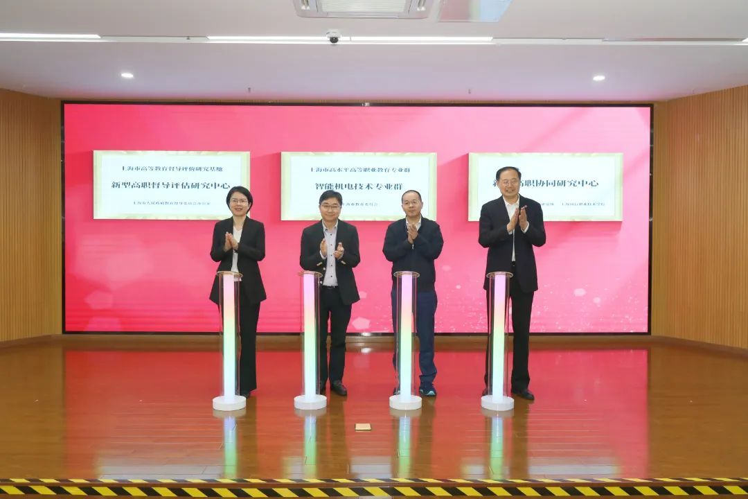 活动现场,“上海市高等教育督导评价研究基地—新型高职督导评估研究中心”、闵职院“智能机电技术”市级高水平专业群和“新型高职协同研究中心”正式揭牌,各方将在推动闵职院高质量发展的基础上,推动闵职院探索区属新型高职院校的发展模式、运行机制及实现路径,开展新型高职教育教学模式及五年一贯制人才培养的研究和实践。