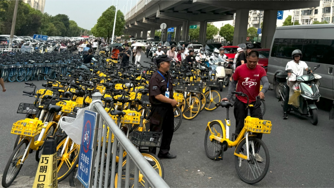 近日,上海唯庭物业管理有限公司九亭地铁站秩序维护队经理金明向记者介绍,每天早高峰,附近停车区域大概会停放4000多辆居民的非机动车,“算是超负荷了”,此外,还会有1000多辆共享单车从四面八方汇聚至此↓↓↓