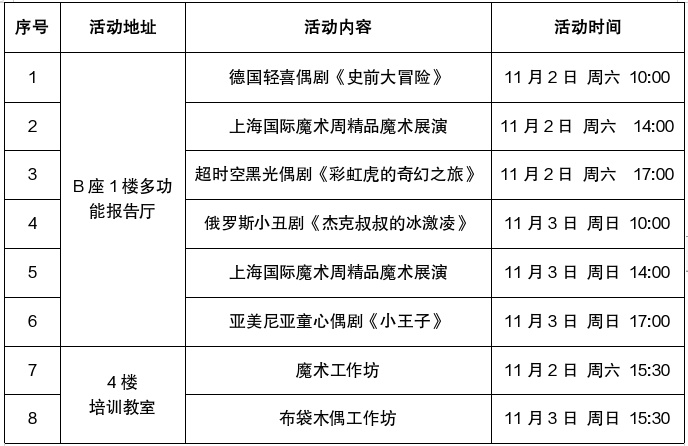 普陀区系列演出——“周末亲子魔幻剧场”由上海市普陀区文化和旅游局、中国上海国际艺术节中心主办,上海亚益文化传播有限公司承办,上海少年儿童图书馆协办,本次艺术天空普陀区系列演出“周末亲子魔幻剧场”特邀国际知名魔术师、国际知名木偶剧、俄罗斯小丑剧,让孩子展现天真烂漫的天性,激发其思维创造及动手参与能力,体验多姿多彩的校外文化,增强亲子间的陪伴与协作,增进家庭的和睦与相亲,同时促进国际儿童文化艺术的交流及发展。6场演出+2场工作坊免费预约、凭票入场!
