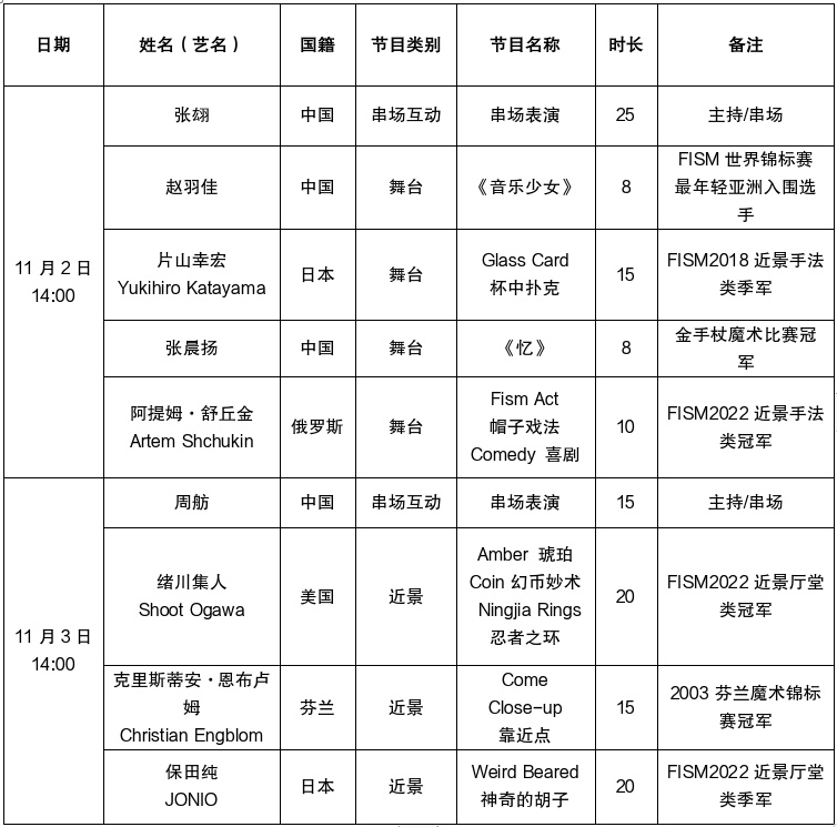 本场艺术天空魔术演出将于11月2日、3日下午14:00于上海少年儿童图书馆开演,由来自俄罗斯、日本、中国这3个国家的4位魔术师带来其代表作品,其中既有FISM魔术世界冠军、2019年魔法之环一等奖获得者、也有来自魔都新秀的优秀青年魔术师。他们的表演将不仅仅是技巧的展示,更是情感和创意的融合。相信他们将为艺术天空的各位观众呈现世界级顶级舞台魔术潮流与风范。