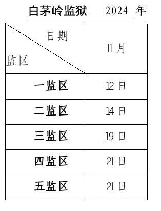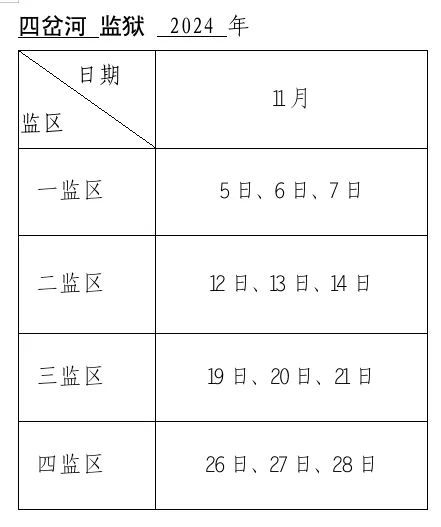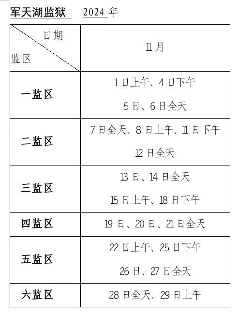 1、白茅岭监狱、军天湖监狱、四岔河监狱、吴家洼监狱除集中会见日外,特殊情况节假日、周末外,每周第一个工作日下午至最后一个工作日上午均可会见。