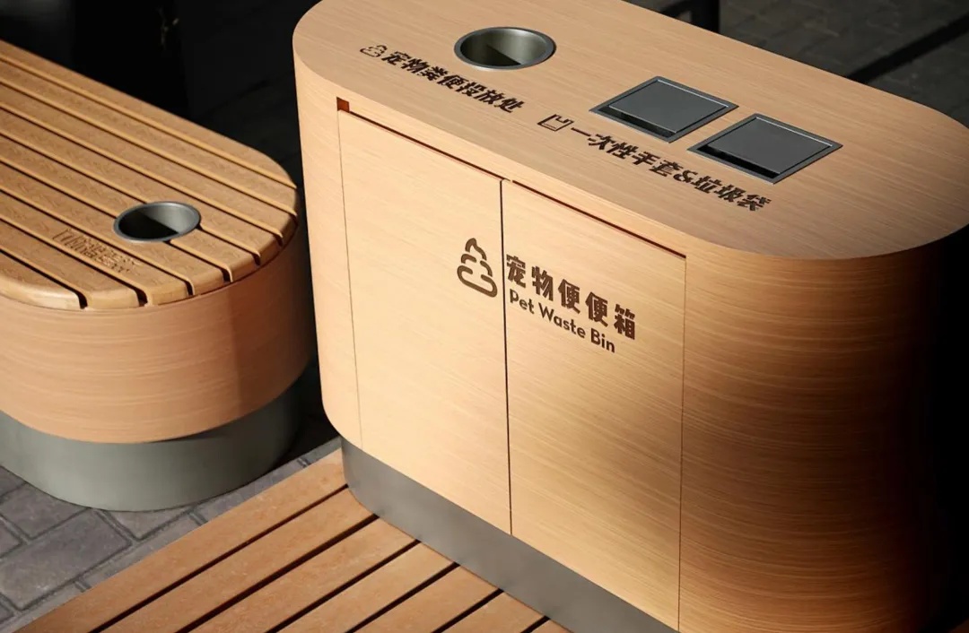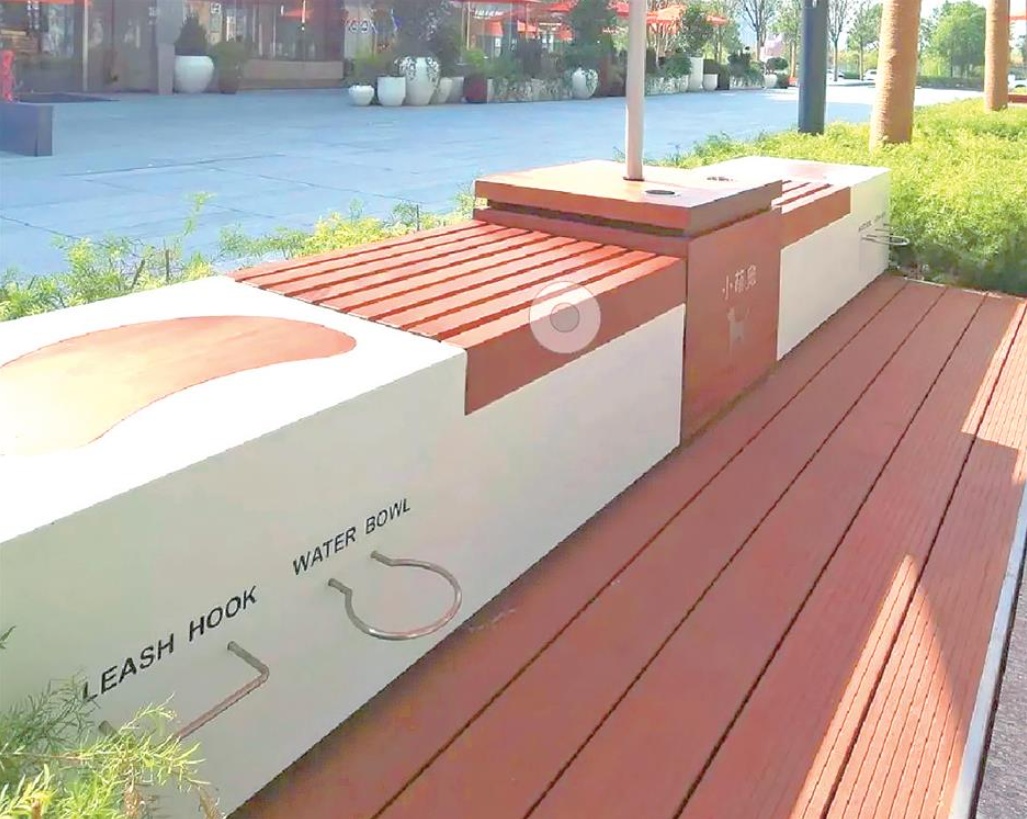 Pet-friendly seating along Jianghua Road, with flexible circles to hold pet leashes and water bow