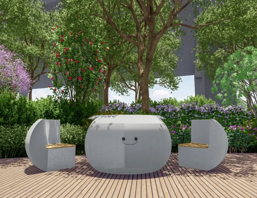 The seats in the northeast corner of Beiqing Highway and Jidi Road were inspired by a small percussion drum in Shanghai, an intangible cultural heritage item of the city. The surface of the drum can be dismantled to be used as a table, while its body serves as seats. The entire design encourages communication.