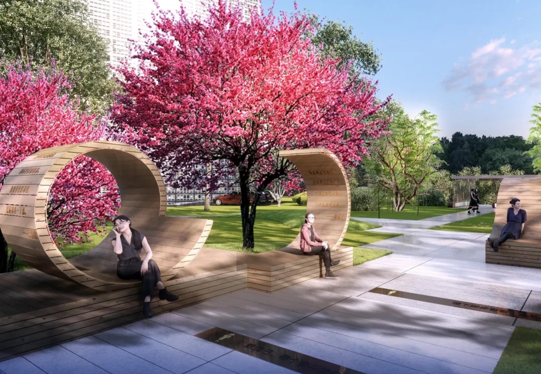 Similar seats have been built in the northeast corner of the crossing between Qixin Road and the G60 Highway. They are in the shape of traditional Chinese bamboo slips.