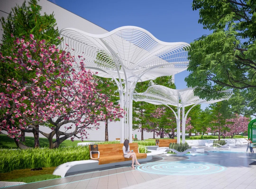 The green space in the northwest of the crossing between Lianhua Road S. and Yindu Road has art-themed seats that resemble lotus flowers. In Chinese, lianhua, means lotus.