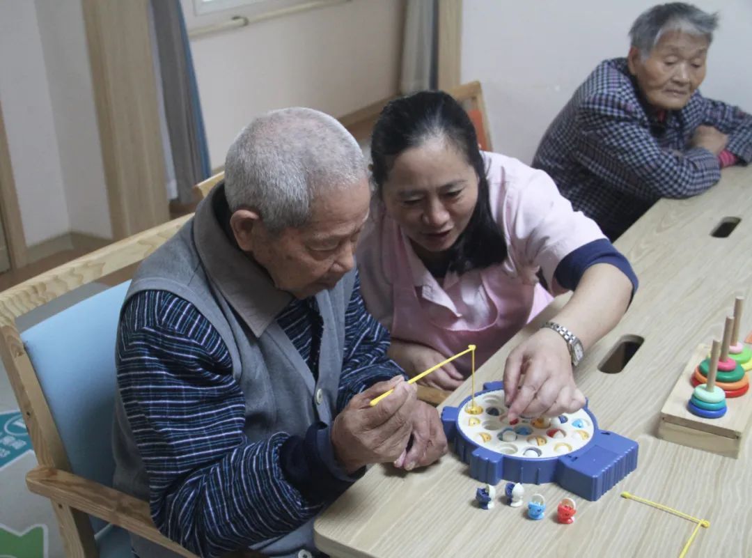 认知专区的护理员还专门排了课表、开设锻炼小课程,用色彩缤纷的教具带着老人们动手动脑。当天,老人们正在上“钓鱼课”,护理员在桌上放置着旋转的钓鱼教具,老人手持小鱼杆,小鱼杆上的磁铁和小鱼相贴,小鱼就能被钓起来。“时光徐行”认知专区护理组长周洁介绍,这些教具都是小孩子们的学前教具,用来锻炼老人的手眼协调能力。