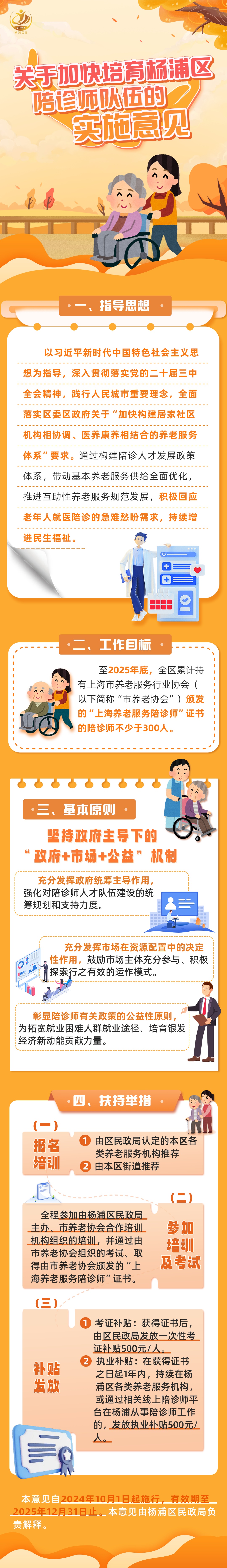 为落实积极应对人口老龄化国家战略,完善养老事业和养老产业发展政策机制,加快构建医养康养相结合的“幸福养老”服务体系,出台了《关于加快培育杨浦区陪诊师队伍的实施意见》(杨民发〔2024〕45号),为全市陪诊服务创新发展提供“杨浦样本”。一起来了解~