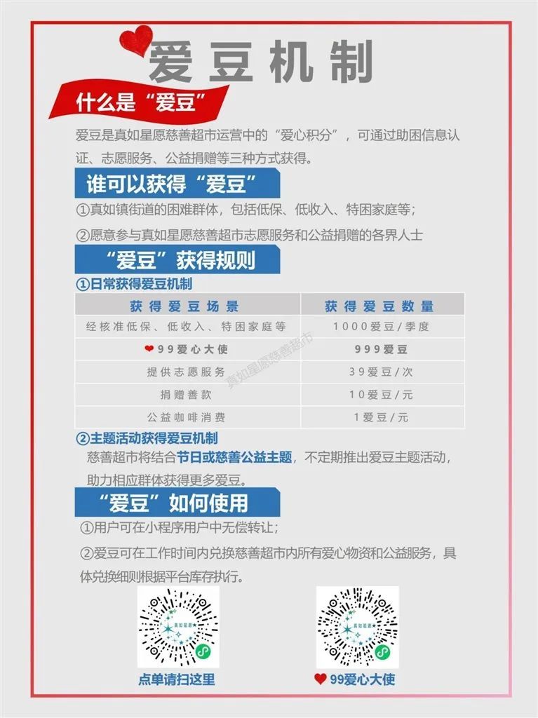 “爱豆”并非一般意义上的积分,而是真如星愿慈善超市一种特色爱心积分系统。居民可以通过参与志愿服务、认证助困信息、购买咖啡以及公益捐款等多种途径,在“真如星愿”微信小程序中获取“爱豆”。