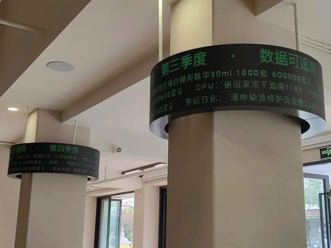 纵相新闻记者注意到,超市入口处的两个环形屏十分特别。其中一个显示了爱心企业名称、所捐赠的商品与相应的“爱豆”,另一个则显示了困难群众所居住的小区与获得的帮扶“爱豆”数。团队希望以数字化形式推动慈善的公开透明。