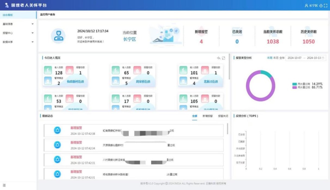 2023年,长宁区开展老年人智能水表安全监测服务试点工作,为全区533户独居老人开通智能水表监测服务,根据老人每天24小时内用水量监测情况,确定智能水表报警规则,用水量触发报警值后产生报警信息,然后AI语音外呼紧急联系人,若无法完成告警联系的,再由系统派单至居委工作人员进行上门确认情况并结单,形成“发现-上报(预警)-处置(派单)-反馈”闭环,有效运用信息化手段为养老服务“赋能”,扩大了对独居老人的关爱服务覆盖面。