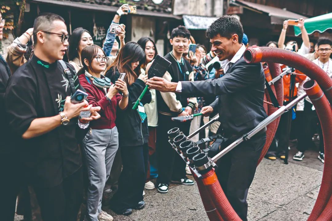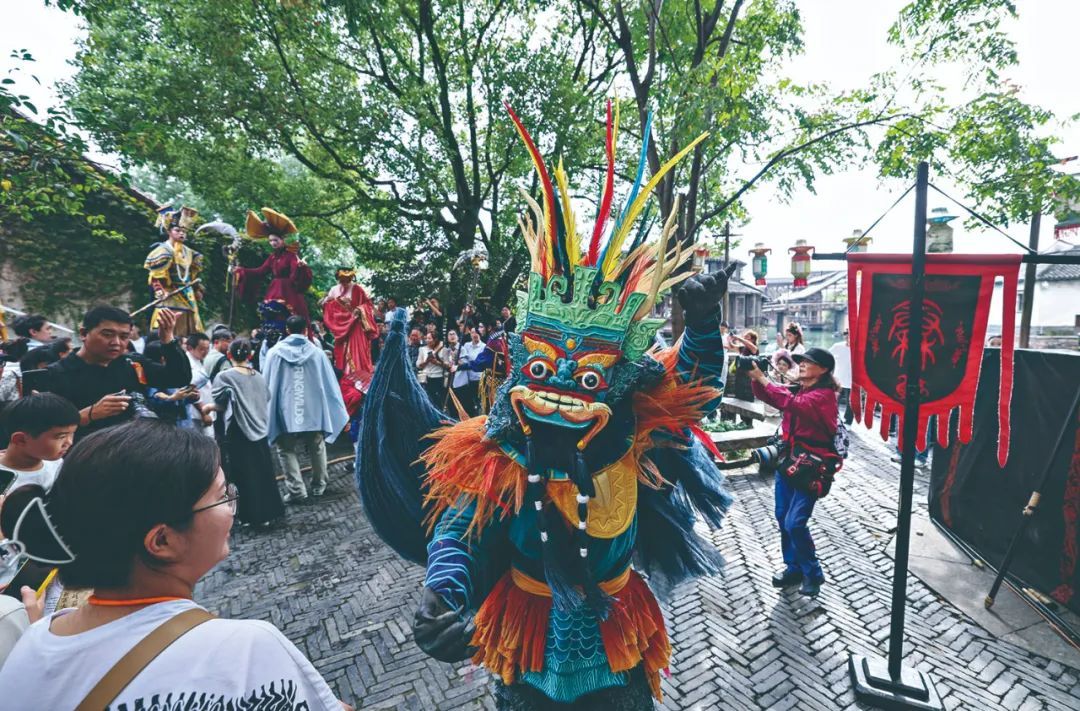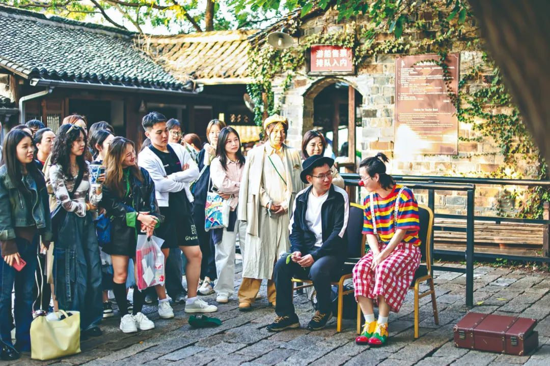 今年古镇嘉年华的巡游队伍兵分三路,从日月广场、昭明书舍、安渡坊出发,汇成一条盛大的热情河流。灰蓝两色气球填满了西栅大街。11天中,一场场戏剧盛宴在剧场、巷尾、园林、水系、丝厂、粮仓全天候上演。
