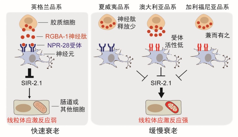 研究团队通过研究来自世界不同地区的野生型线虫各种行为功能,发现它们随衰老退化速度存在着显著差异。进一步研究揭示了一条新的、调控衰老速度的胶质细胞-神经元信号通路:由胶质细胞释放一种新型神经肽RGBA-1,作用于五羟色胺和多巴胺神经元上NPR-28受体,抑制由蛋白去乙酰化酶SIR-2.1介导的线粒体应激反应,促进线虫衰老。