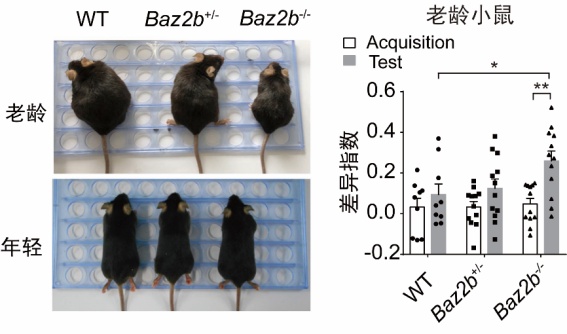 表观遗传因子BAZ2B调控行为和认知衰老进程。左为野生型(WT)、Baz2b半敲除(Baz2b+/-)、Baz2b全敲(Baz2b-/-)小鼠图像;右为小鼠对物体新位置识别能力指数统计。