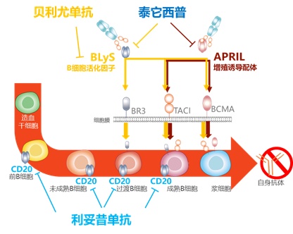 图2:用于治疗系统性红斑狼疮的生物制剂药理作用机制