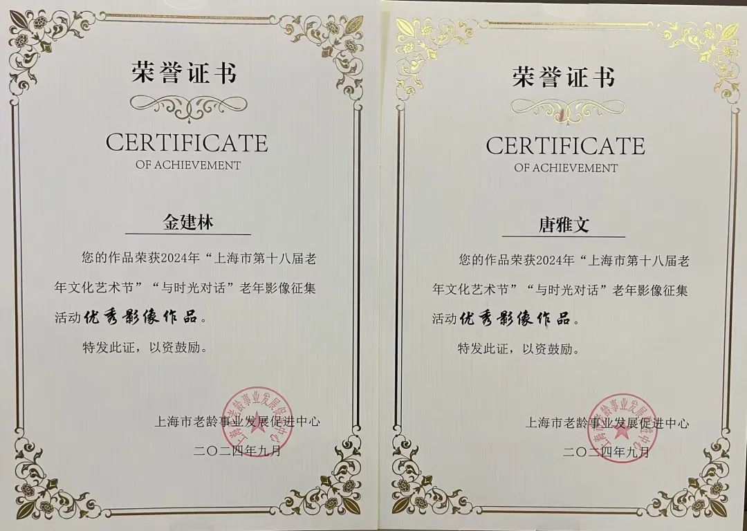 今年7月,2024年“上海市第十八届老年文化艺术节”之“与时光对话”老年影像征集活动发布,摄影小组成员踊跃投稿,最终七位成员的作品参选,其中唐雅文和金建林两位老人更是荣获2024年“上海市第十八届老年文化艺术节”“与时光对话”老年影像征集活动的“优秀影像作品”奖项。