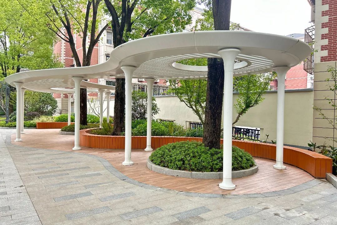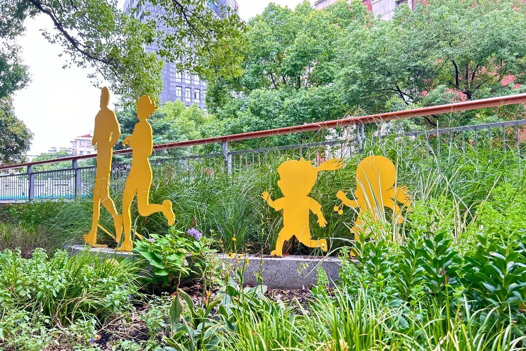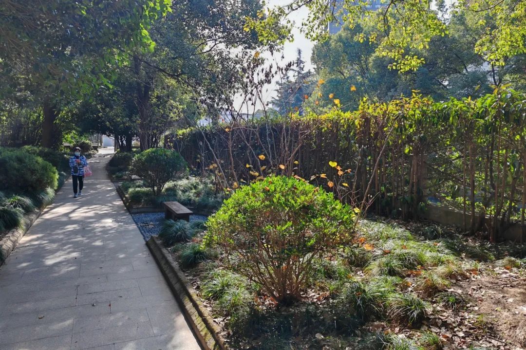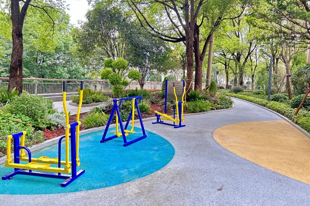 经过精心设计与综合改造,在保留原有大型乔木的基础上,对绿地内的植物配置进行优化,使得绿化层次更加丰富。同时,增加休息廊架、休闲步道、健身器材等设施,步道两侧还因地制宜地设置了坐凳和观景平台,并融入艺术文化装置,为周边居民打造一个集健身、观景、休憩、社交于一体的理想场所。