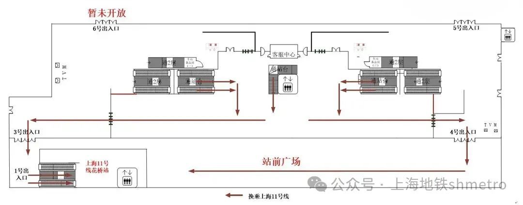 通过出站闸机后,从3号口、4号口出站至上海花桥站1号口进站换乘。
