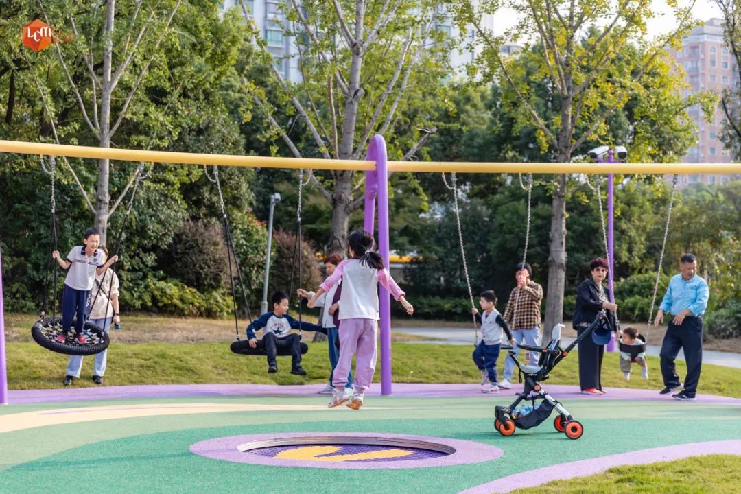 围绕“儿童友好”这一定位,“飞羽浅滩”口袋公园互动设施丰富多样。在设计上,公园以紫、粉、黄三种色彩为主色调,充满童真活力。