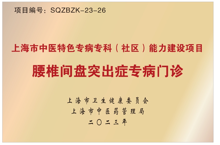 宝山区张庙街道长江路社区卫生服务中心中医针伤门诊开设至今已有20余年历史,2017年,中心开设“腰椎间盘突出症中医专病门诊”。该门诊以综合保守治疗为特色,形成一套具有自身特色、深受百姓认可的腰突症中医药临床诊疗模式,并先后获得2018年宝山区医学特色专科和社区项目建设、2020年宝山区首届基层卫生医学“品牌”培育项目,2023年,成功立项上海市中医特色专病专科(社区)能力建设项目。“田字九针镇痛法”治疗腰椎间盘突出症的中医特色技术获得2018年上海市中医特色诊疗技术提升项目和宝山区区级医学卫生项目,达到市级优势病种建设水平。