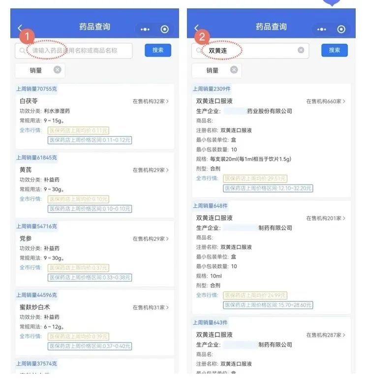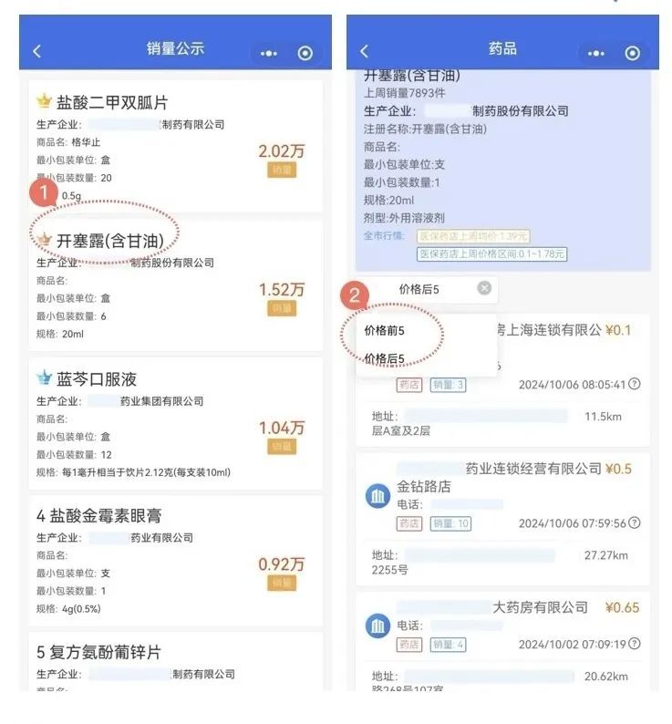 页面展示销量前20的药品,点击药品,进入药价公示后,可查询到价格后5和前5的5家药店。