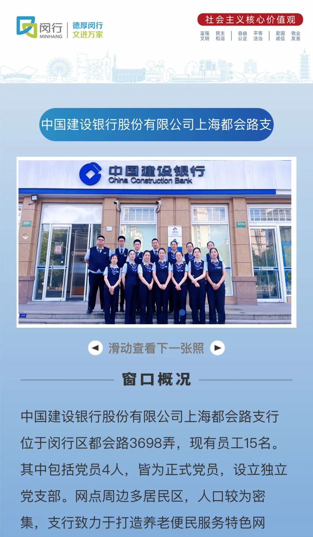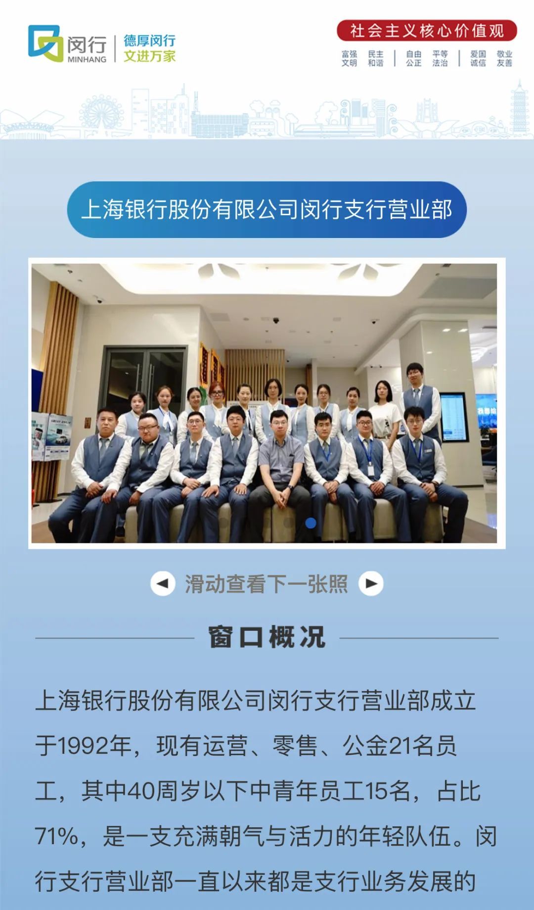 近年来,闵行区秉承人民城市重要理念,深化窗口单位同创共建,以更加开放奉献的姿态,推动窗口单位的创新发展。作为文明传播的重要载体,各窗口单位团结一致,致力于展现文明闵行的崭新面貌,在闵行区创建全国文明城区工作中发挥了积极作用,让人民城市重要理念在服务中熠熠生辉。