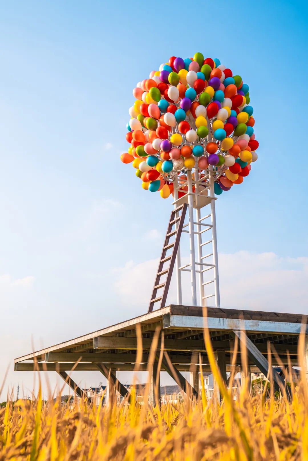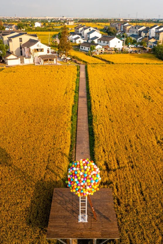 在莳下田园餐厅,游客可以沿着乡间小道走向稻田中央的网红打卡地——《飞屋环游记》同款的气球装置,十分出片。
