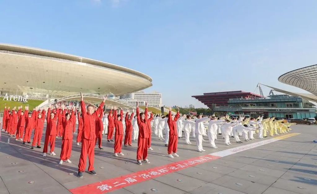 第二届“济德杯”社区八段锦展演同日举行。由南码头居民组成的35支队伍、400余人身着五色服装,在黄浦江畔展演八段锦。结合上海市气功所专家的讲解,上海中医药大学的学生们也在舞台区域进行养生功法的展示。