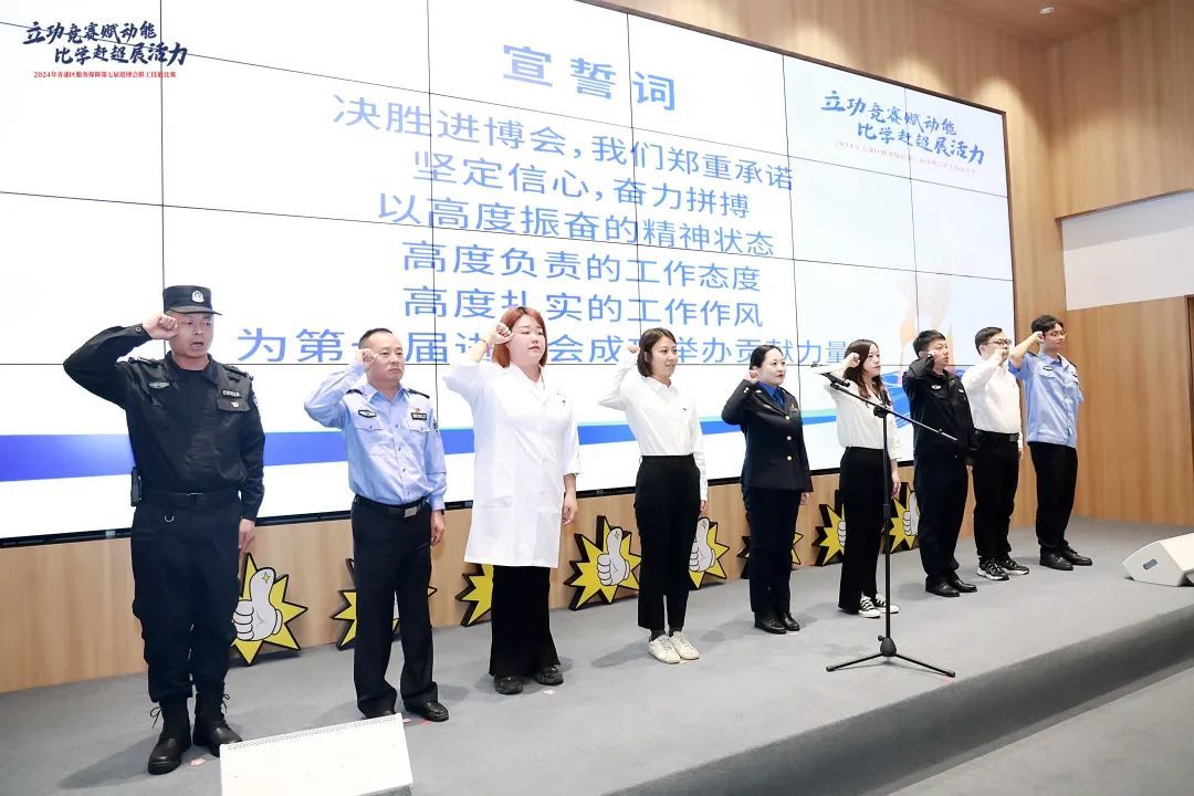 “坚定信心、奋力拼搏,以高度振奋的精神状态,高度负责的工作态度,高度扎实的工作作风,为第七届进博会成功举办贡献力量。”当天,徐泾镇9支保障进博职工突击队代表进行了宣誓,铿锵的誓词,展现了徐泾广大职工服务保障“家门口”盛会的热情和决心。