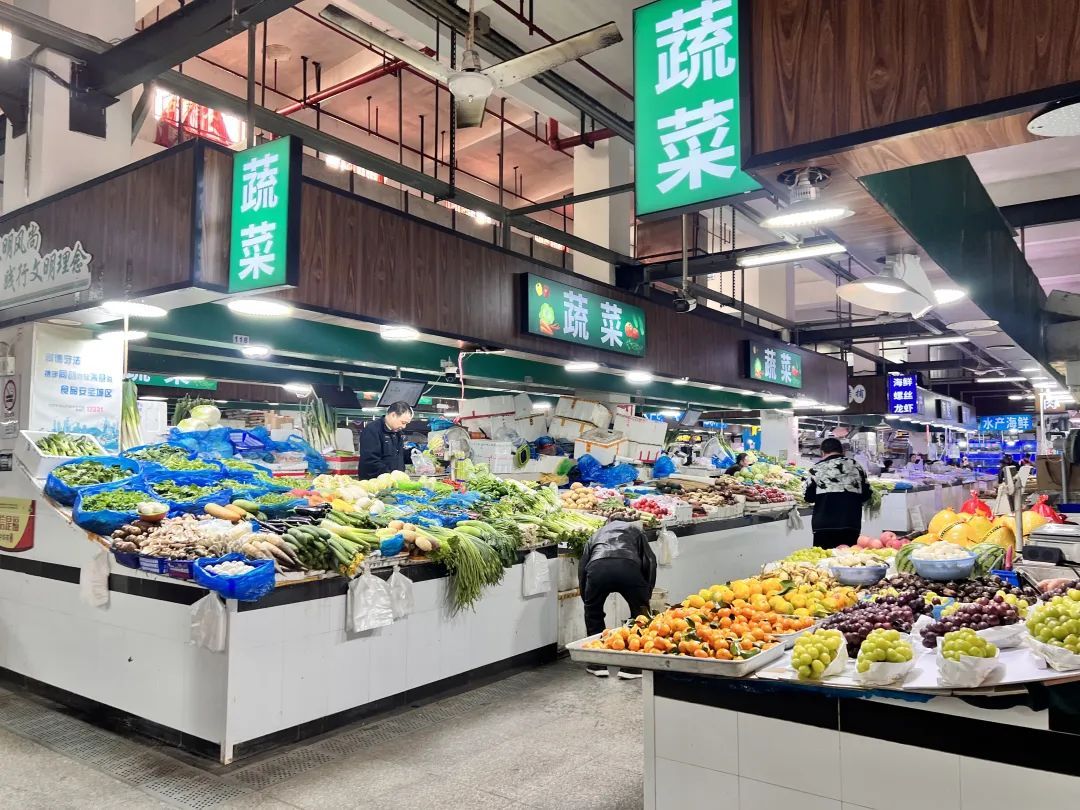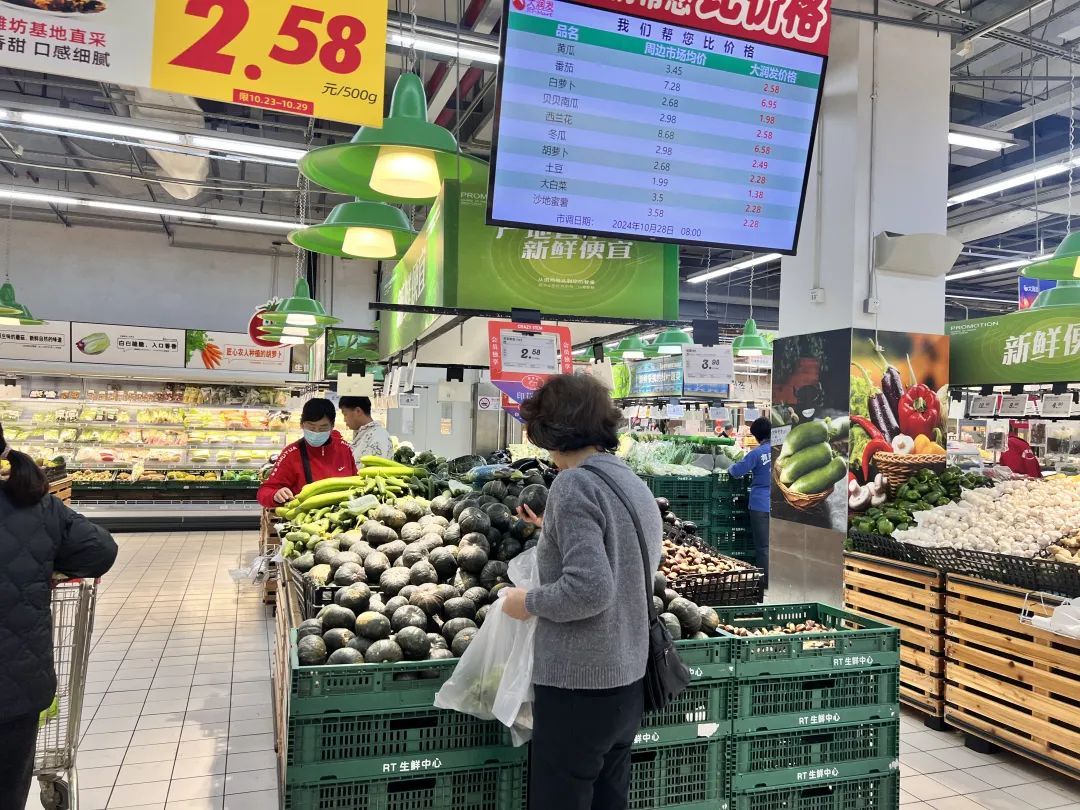 随后记者来到大润发澄浏店看到,蔬菜区货架整齐划一,新鲜的时令蔬菜摆放整齐,吸引不少顾客驻足选购。