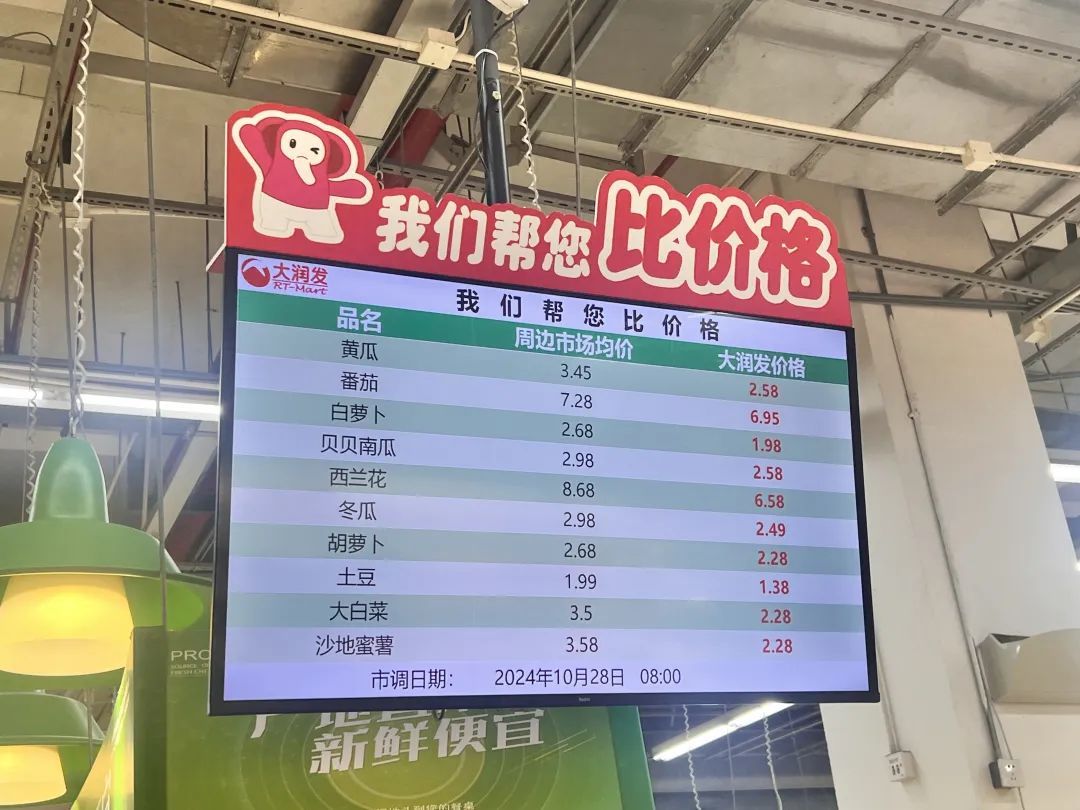 记者发现,大润发蔬菜区特设大屏幕,实时展示各类蔬菜周边市场均价及本店价格。陈坚慧介绍,门店还强化了蔬菜质量控制,配备专职品控人员严格把关,让顾客安心选购,放心食用。